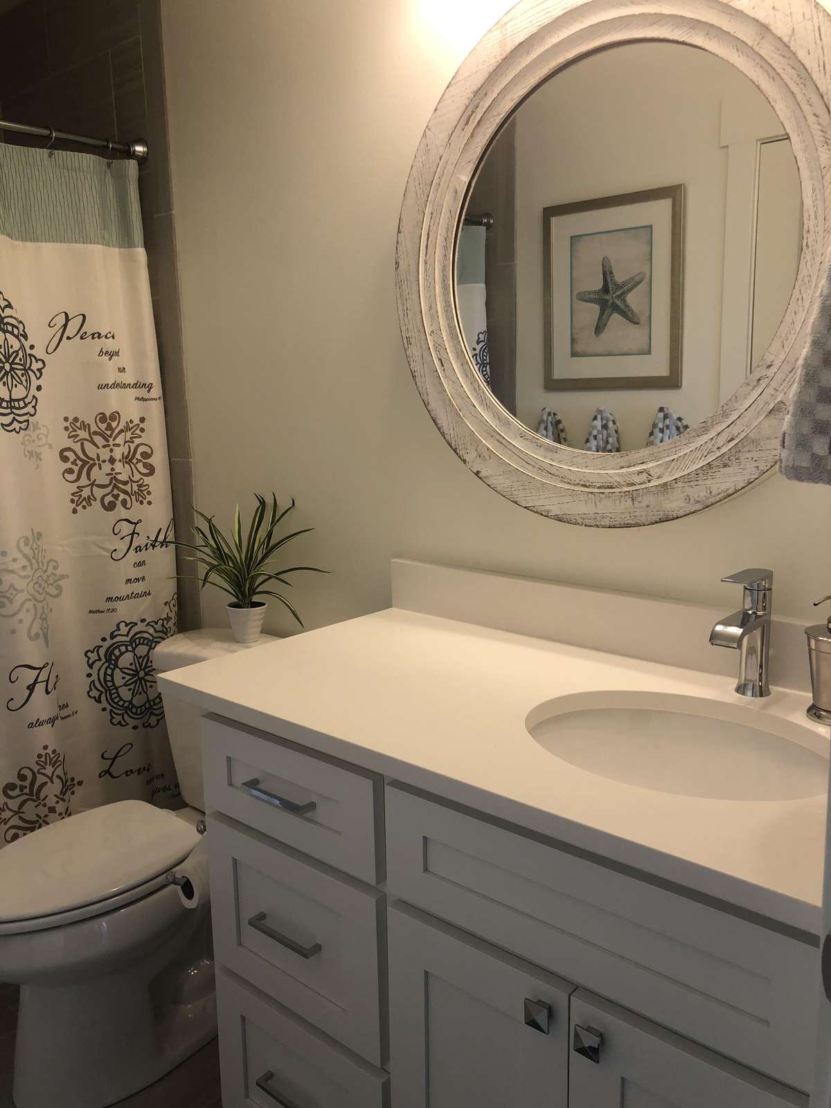 As you head upstairs you will notice the large open living space with a big screen TV and a giant couch that's perfect for movie nights. The other three bedrooms and two full bathrooms of the home are located upstairs as well. The bedrooms are arranged to accommodate families or those willing to share rooms with a king bed and a set of bunk beds in each of the first two bedrooms. The other bedroom is where you find the remaining four queen beds in a room we like to call the party room. Kids and couples alike will enjoy sharing bedtimes stories from the day and what the next day will bring.